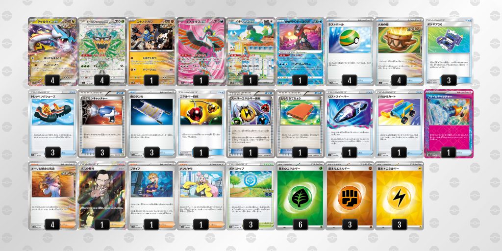また、タケルライコexは軸である強力サポートカード オーリム博士の気迫がなくなってしますため、かなりの弱体化になってしまう。オーガポンみどりのめんでエネルギーを溜めつつアカマツなどでタケルライコexのエネルギーを準備することになりそうじゃ。