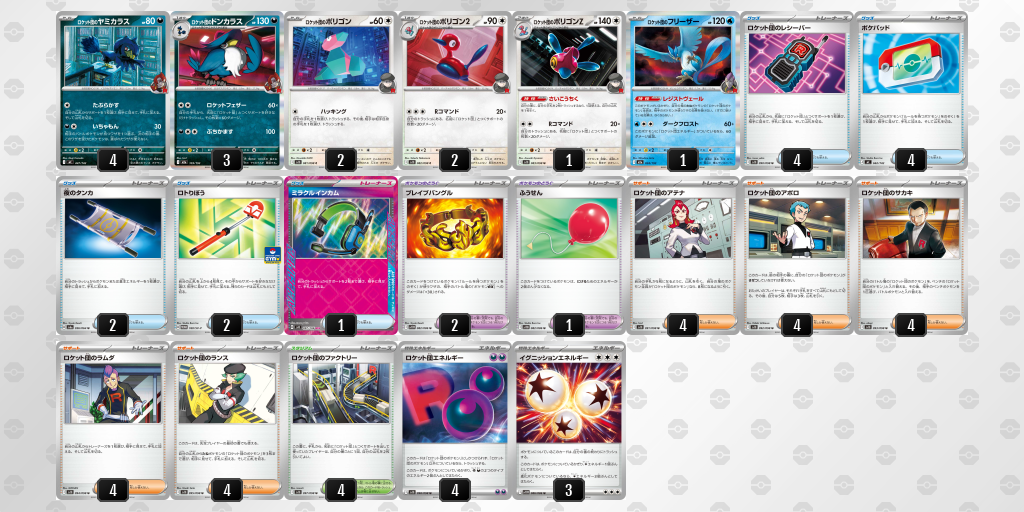 サブアタッカーとしてロケット団のポリゴン2やポリゴンZを採用しており、トラッシュにあるロケット団のサポートの数だけ与えるダメージが多くなるのでドンカラスで攻撃した後の終盤に高火力が期待できるポケモンになっているのじゃ。
