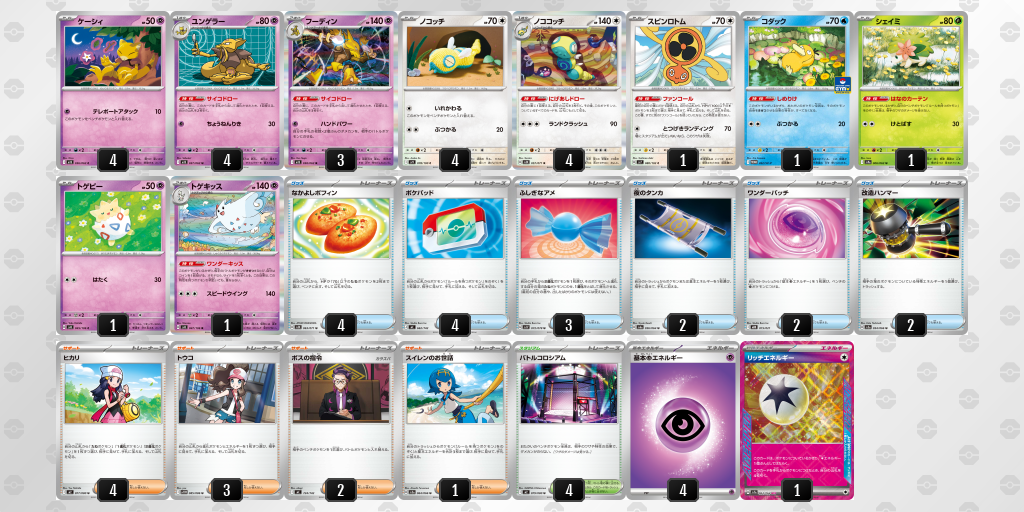 次に紹介するデッキもだが、非エクデッキが強そうな環境であるため、非エクデッキ相手ではサイド差が埋めきれないためトゲキッスを採用してみたのじゃ。トゲキッスは特性 ワンダーキッスを持ち、相手のバトルポケモンがきぜつするたび、自分はコインを1回投げる。オモテなら、サイドを1枚多くとるという特性を持っている。そこでサイド差を埋めたり、広げることができるのじゃ。サイド差を作らないためキチキギスexなどは不採用とした。