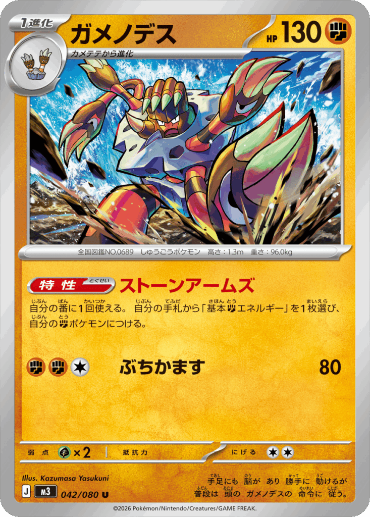 次に紹介するのは、ガメノデスじゃ。自分の番に1回使えて手札から闘エネルギーを闘ポケモンにつけることができるのじゃ。これは複数のガメノデスの特性を使うことができるのでたくさんならべてメガジガルデexのエネルギーを供給することができるのじゃ。逃げるためのエネルギが2個分必要なのでふうせんを採用することになるじゃろう。