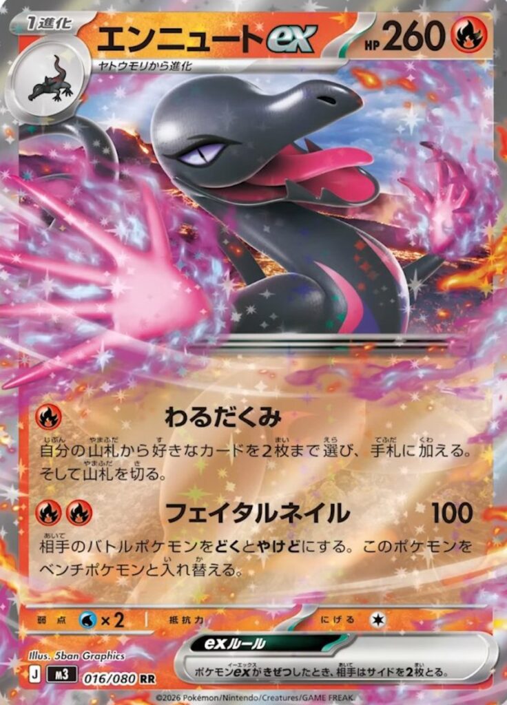 エンニュートexはワザ フェイタルネイルで相手のバトルポケモンをどくとやけどにする。素点が低いのでなかなか使い方を限定されるカードになりそうじゃ。