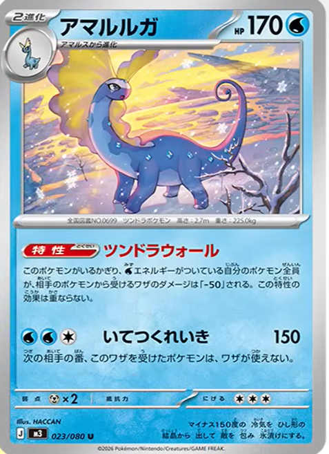 次はアマルルガを紹介しよう。特性 ツンドラウォールをもっており、水エネルギーがついているポケモンは受けるダメージは-50される。次に紹介するメガスターミーexの耐久力を上げるなど様々な使い方ができそうじゃ。