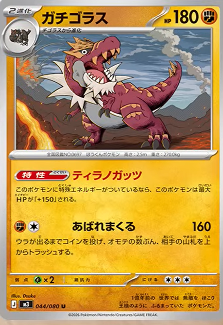 まずは、ガチゴラスを紹介するかのう。特性 ティラノガッツをもっており、特殊エネルギーがついていれば最大HPが+150になるのじゃ。元々のHPと合わせると280になるのじゃ。ワザはそれほど強くはないが、特性 きおくにもぐるをもつジーランスと組わせることで進化前のチゴラスのワザいきりたつが使えダメカンの数×20ダメージのワザが使えるのじゃ。耐久しながら大ダメージを出していけるので知っておくがよい。