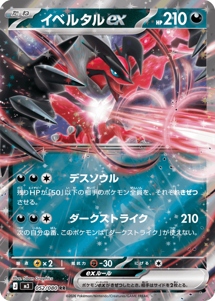 イベルタルexはワザ デスソウルが強力で残りHP50以下の相手のポケモンをすべて気絶することはできる。ユキメノコマシマシラなどのフィニッシャーで使いそうじゃの。Nの筋書きからエネルギーを集めたりとさまざまなエネルギーを付ける手段が考えられそうじゃ。