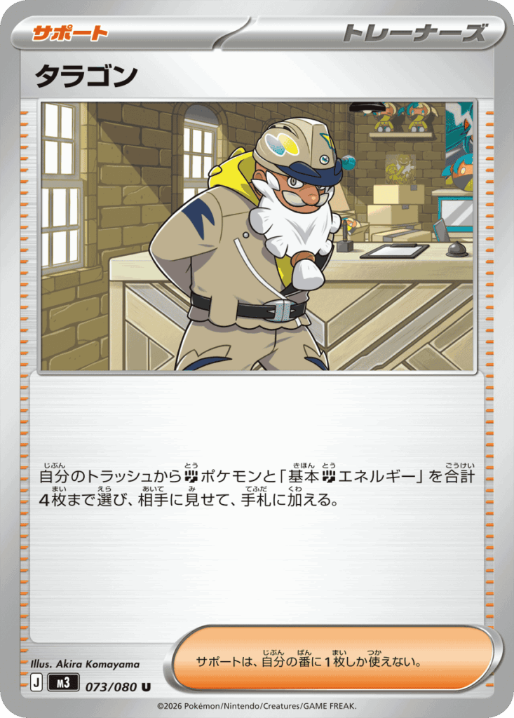 タラゴンはトラッシュから闘ポケモンと闘エネルギーを合計4枚まで選び手札に加えることができる。ソルロックルナトーンでトラッシュしたエネルギーを回収し、カメノデスの特性でエネルギーを使うなど使用用途は限られるが闘タイプのデッキでは1~2枚は入る可能性のあるカードじゃの。
