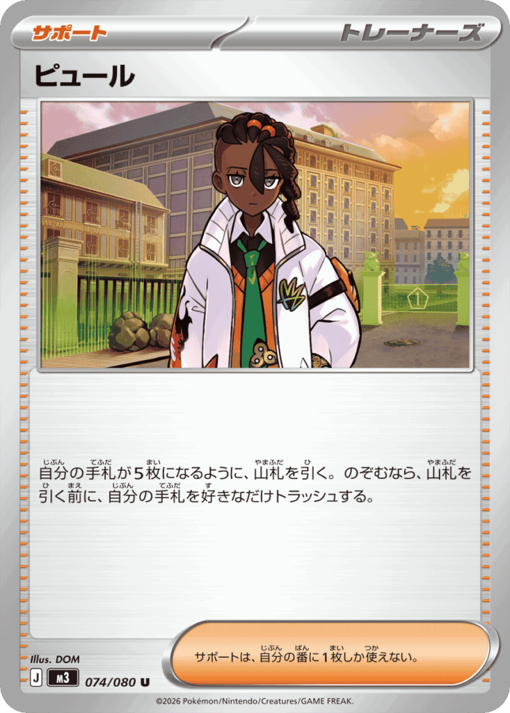 ピュールは手札が5枚になるように引きその際に手札を好きなだけトラッシュするという効果じゃ。ソウブレイズexなどでエネルギーだけトラッシュしたり、終盤のデッキ圧縮のために必要なカードのみ残したりと使い方によっては様々なデッキに入る可能性のあるカードじゃ。