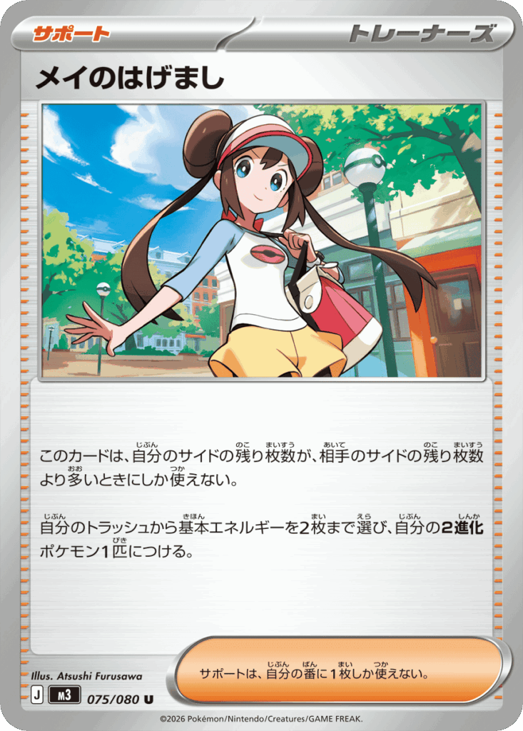 メイのはげましは相手のサイドが自分より少ない場合に使え、トラッシュから基本エネルギーを2枚まで選び2進化ポケモン1匹につけることができるのじゃ。ドラパルトexのエネルギー準備やシロナのガブリアスexなどのデッキに入るかもしれぬのう。